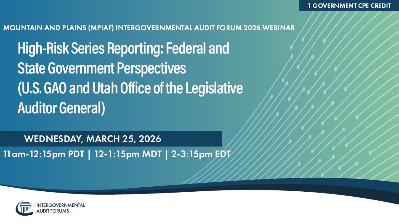 Please note that if you did not officially register for the event, you will not be receiving a CPE certificate. If you participate in this webinar and do not automatically receive our CPE Certificate within 48 hours of webinar completion and would like to request one, please send the confirmation email you received when you originally registered for this event to auditforums@gao.gov with your inquiry. We will get back to you after we check that you had (1) registered for this webinar on time, and (2) fully participated in the webinar. For those who are visiting the webpage and viewing the recording, please note that we will not be offering CPE Certificates to you.